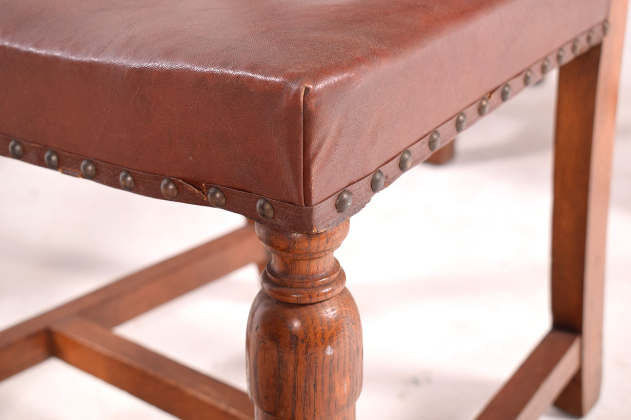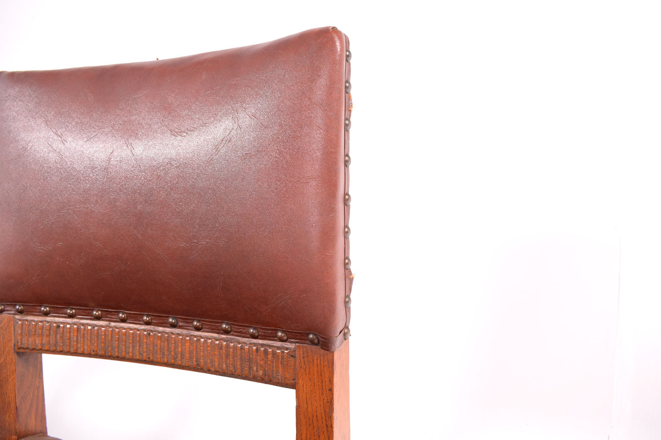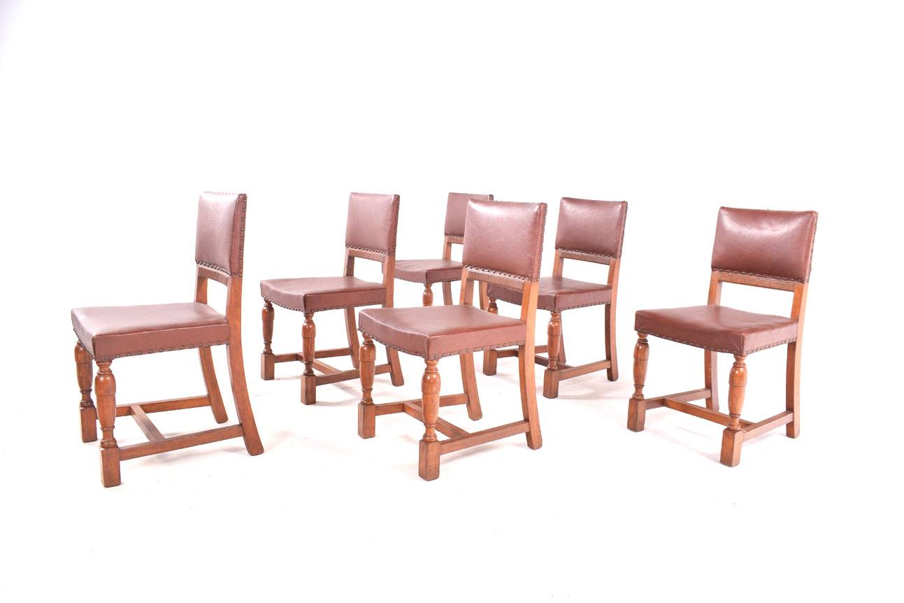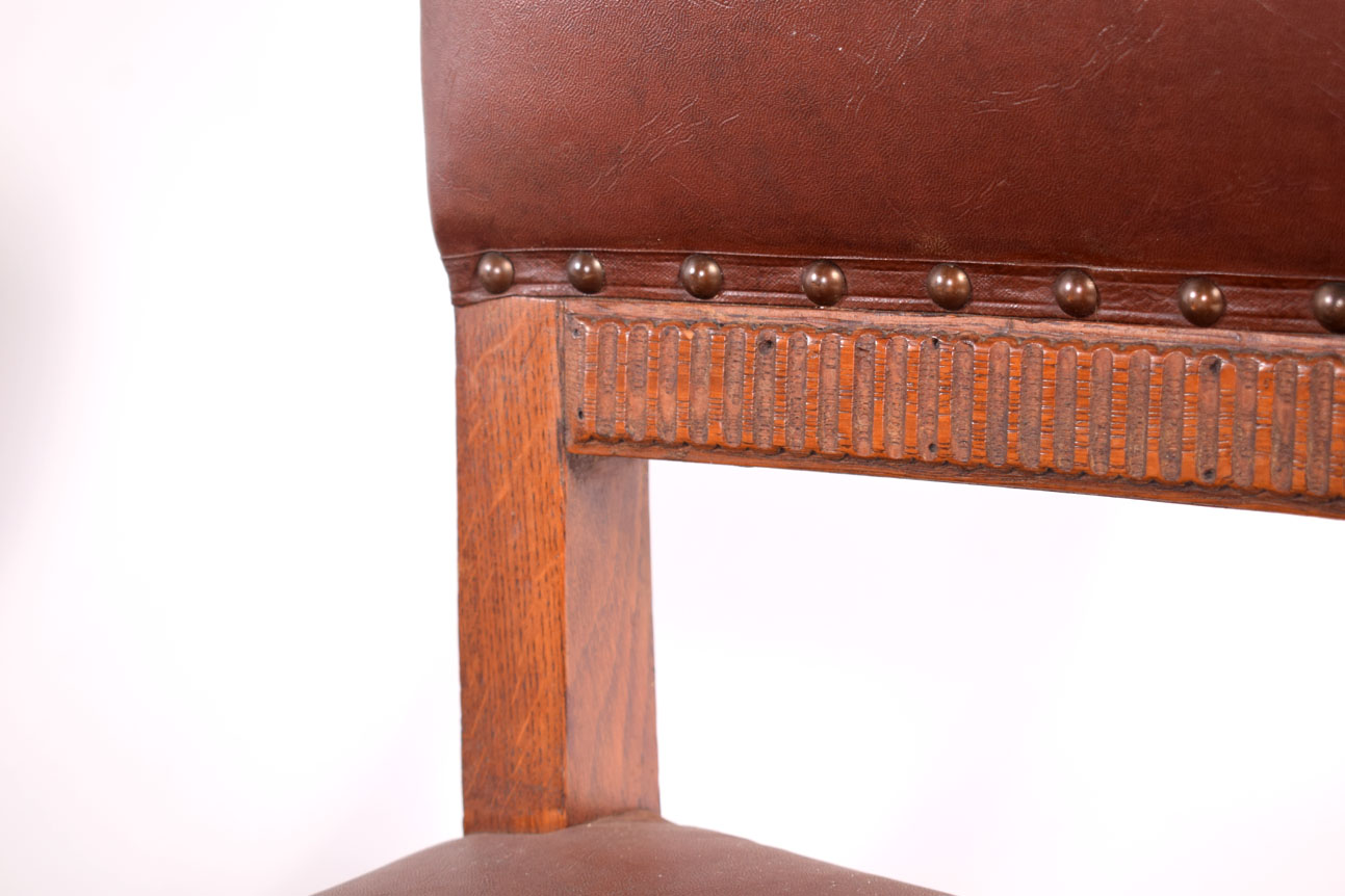 6 cadeiras de jantar Rústicas em carvalho, estofadas a castanho com pregaria. Séc. XX, origem holandesa. Dimensões 82x43x43cm.