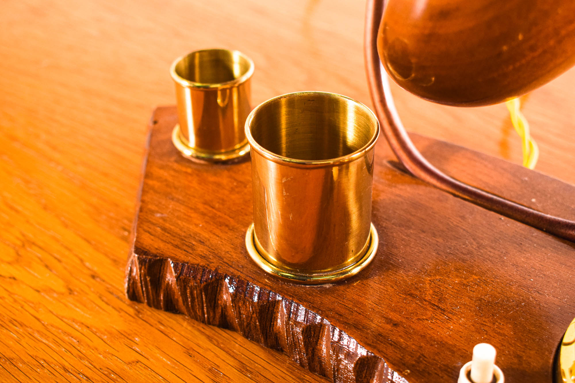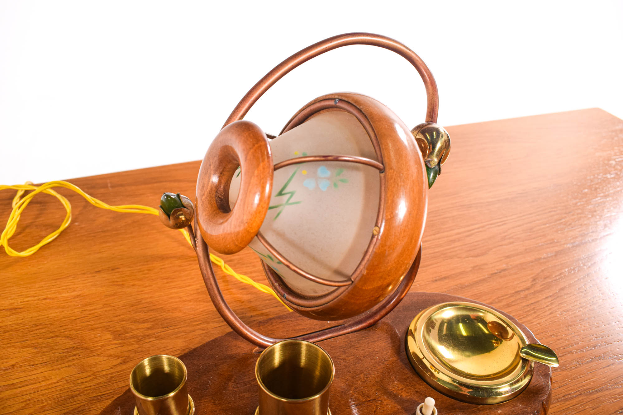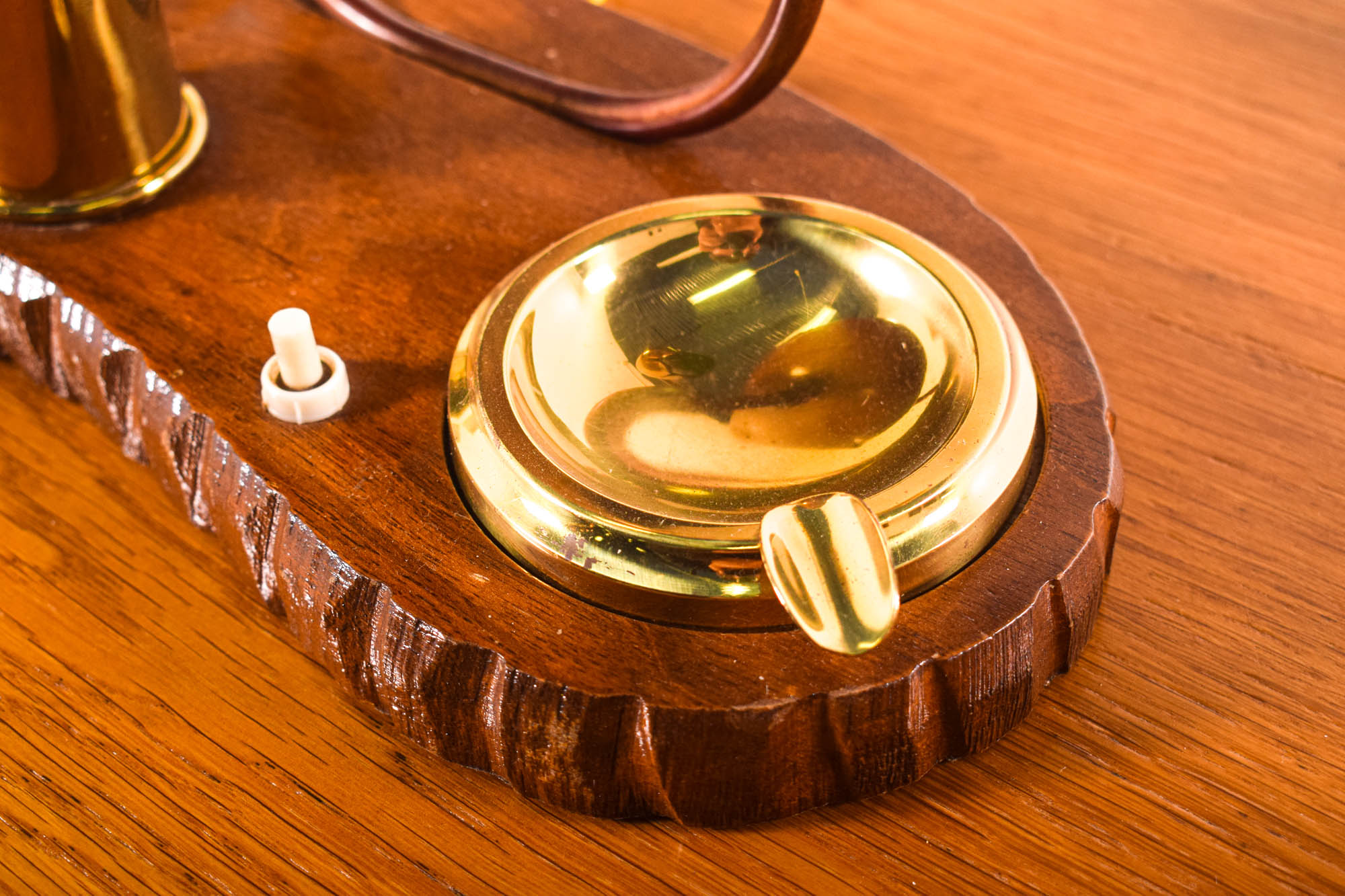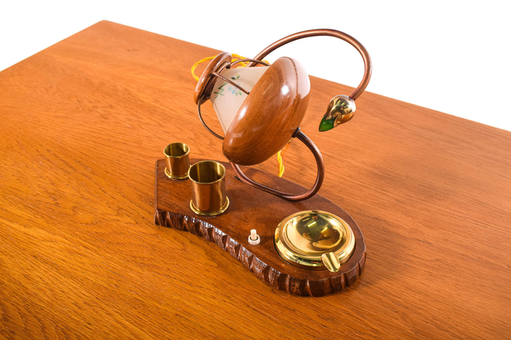 Candeeiro de mesa Arte Nova em forma de flor. Base com duas peças cilindricas em latão, porta fósforos, porta cigarros e cinzeiro.