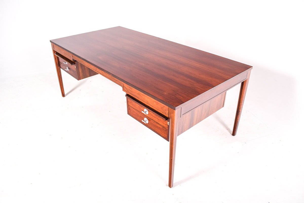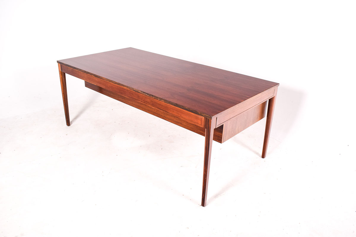 Secretária em Pau-Santo desenhada por Finn Juhl nos anos 60, produzida na Dinamarca pela CADO. Peça de excelente qualidade, com dois módulos de gavetas suspensos no tampo da secretária. Veio nítido de pau-santo. Peça fora de stock, clique para ver mais secretárias.