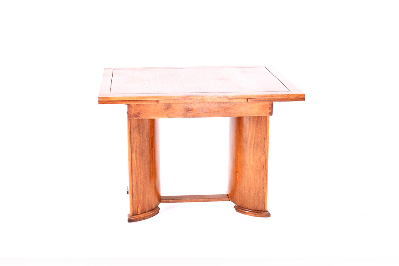 Mesa de jantar francesa Art Deco, madeira de carvalho e folheado, França. Tem uma bela base em forma de arco. Mesa extensível (2x30cm). Fora de stock. Veja mais mesas
