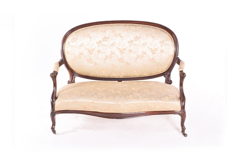 Canapé estilo Luis XV, estofado a bege com flores em brocado, madeira de mogno. Da época Luís XV. Séc. XX e de origem, Inglaterra. Dimensões 104x135x60cm.