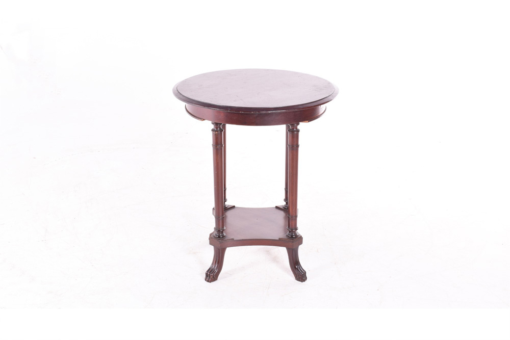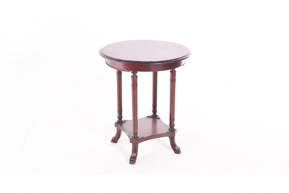 Mesa de apoio redonda, em mogno. com 4 pés e prateleira. Séc. XX e de origem, Inglaterra. Dimensões 73x64x64cm.