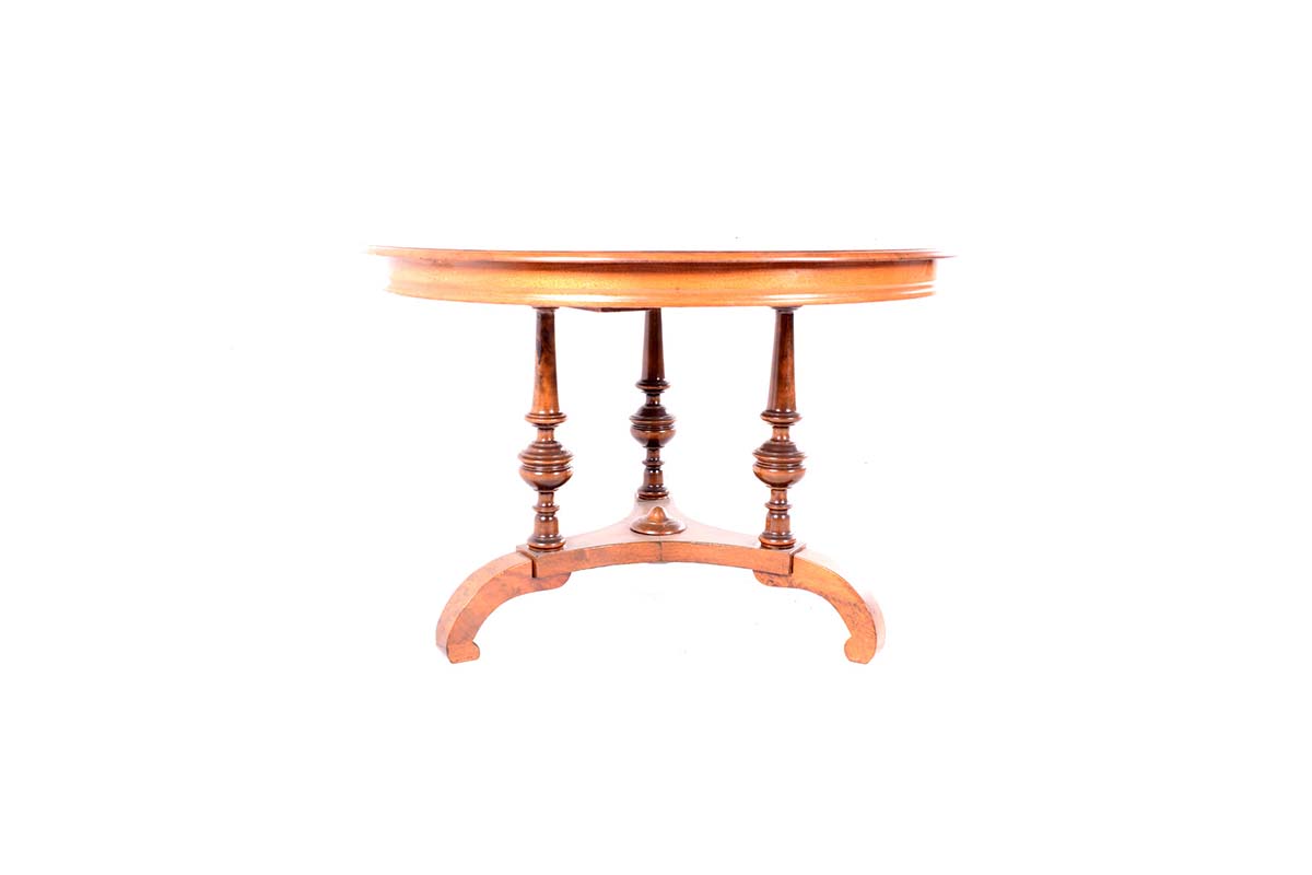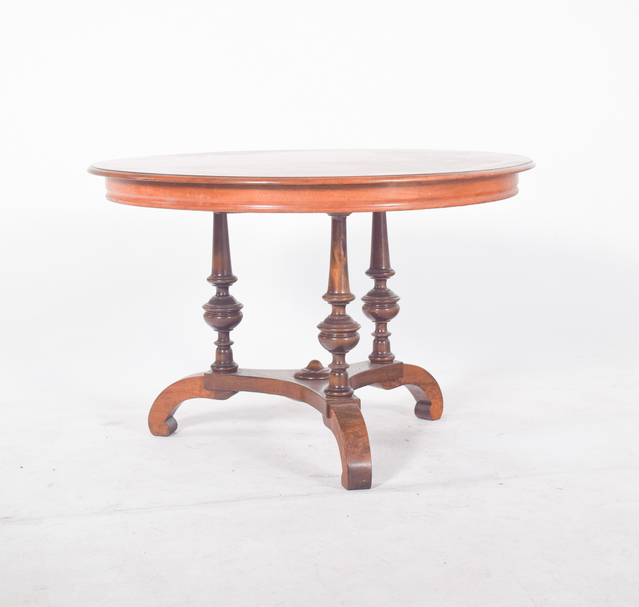 Mesa de centro com tampo redondo e pé central trabalhado. Madeira de nogueira. Séc. XX e de origem Inglesa.
