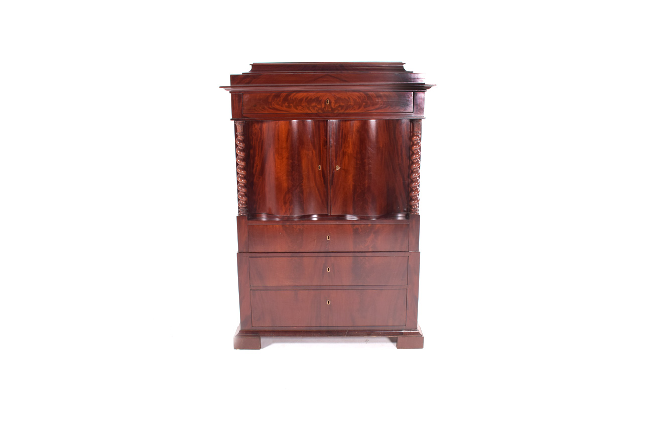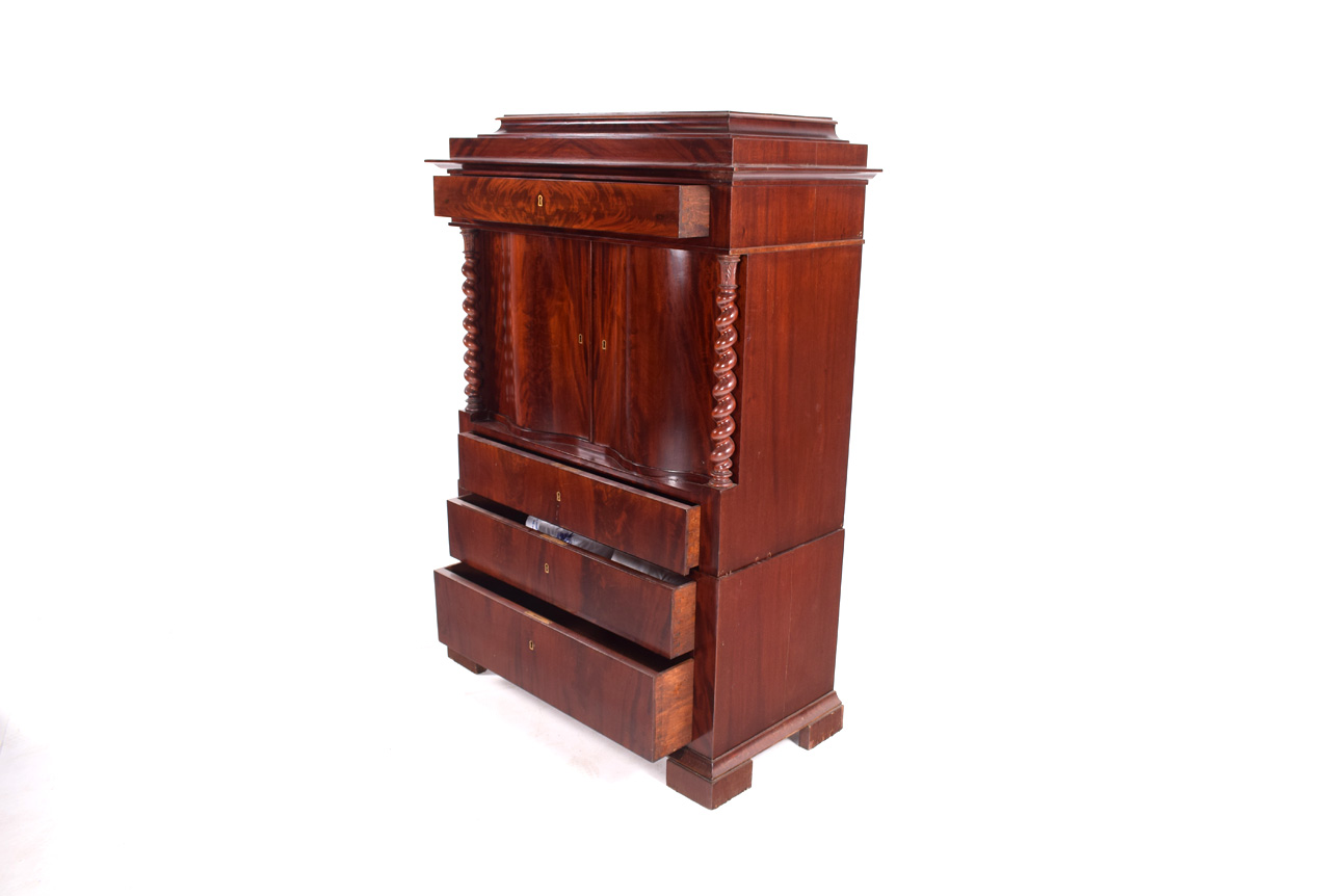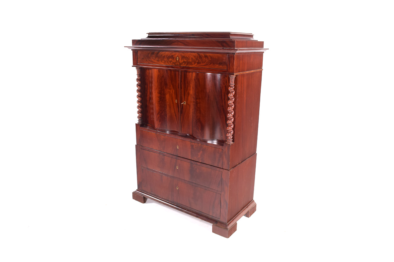 Móvel alto inglês em mogno, com duas colunas de torcidos. Da época Romântica. Séc XX e de origem, Inglaterra. Dimensões 160x110x53cm. Fora de stock. Veja mais móveis