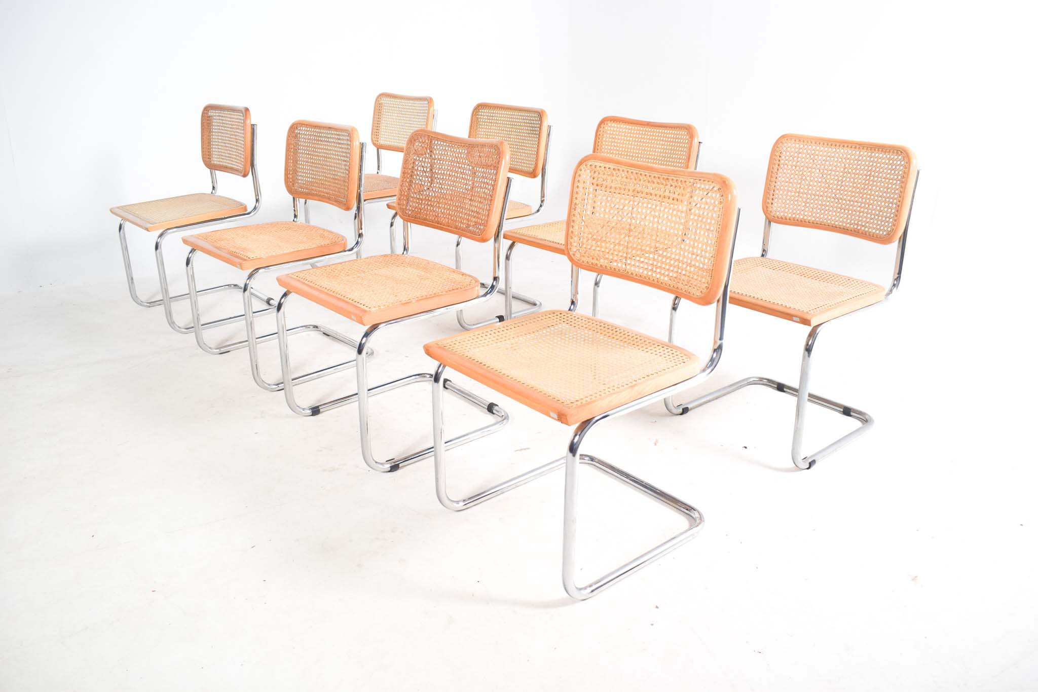 Par de cadeiras de jantar réplicas Cesca, idênticas às desenhadas por Marcel Breuer em 1928 e produzidas neste momento pela Knoll. Estrutura tubular cromada e madeira de faia, assento e costas em palhinha. Datas de fabricação diferentes.