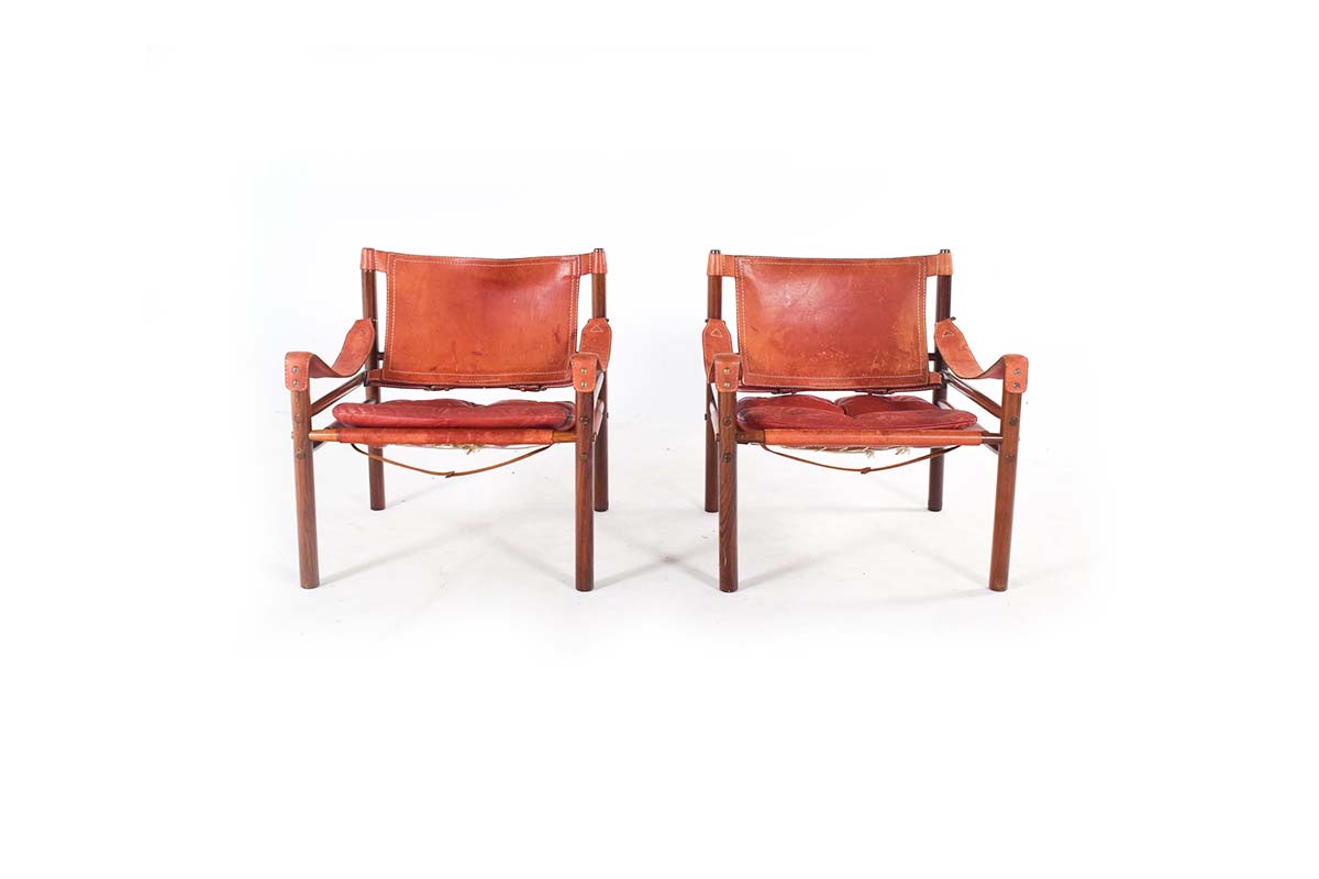 Par de cadeiras de braços em pau-santo, com estofos em pele castanha avermelhada. Modelo Sirocco, desenhadas por Arne Norell e produzidas na década de 60, Suécia.