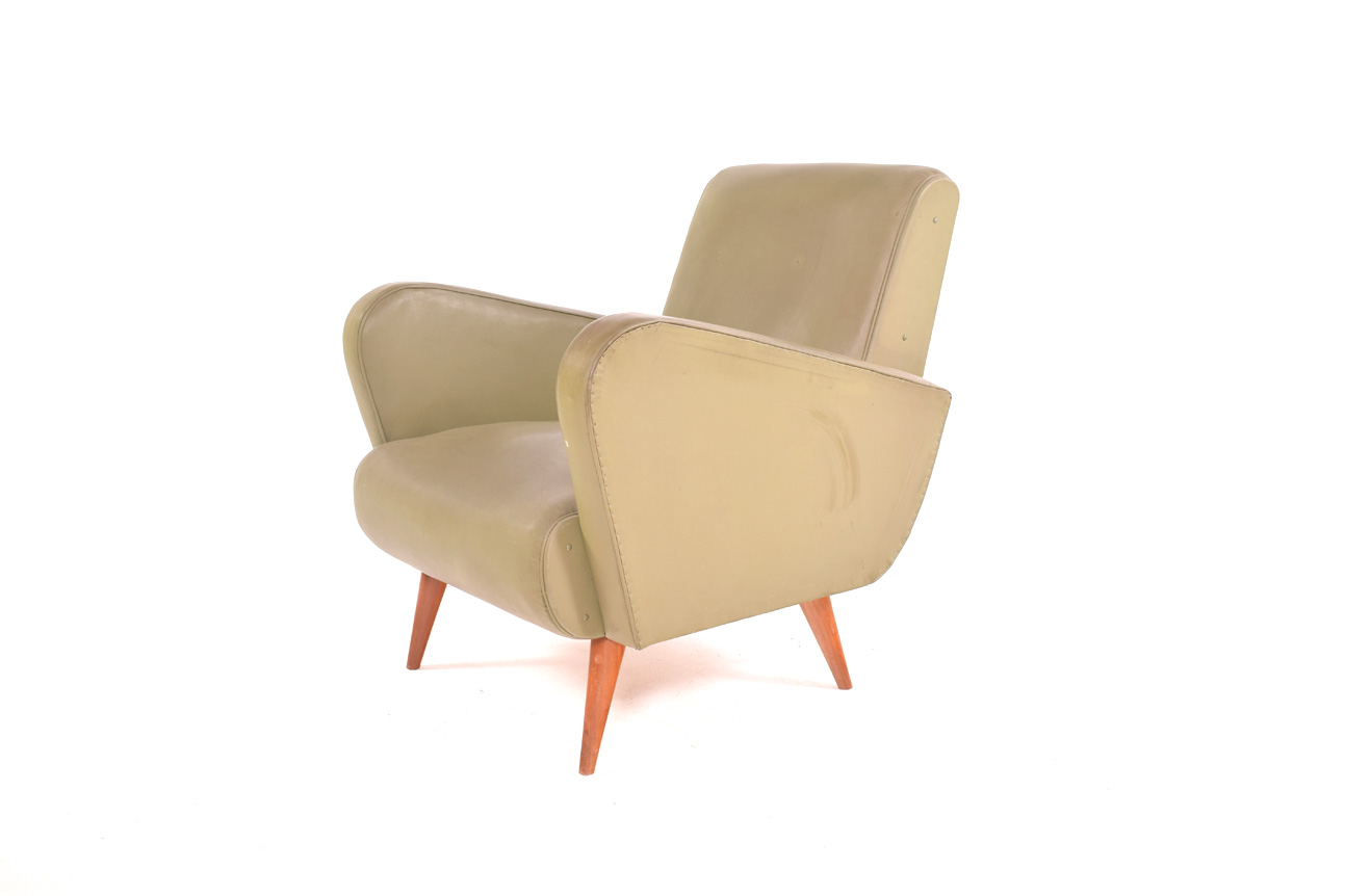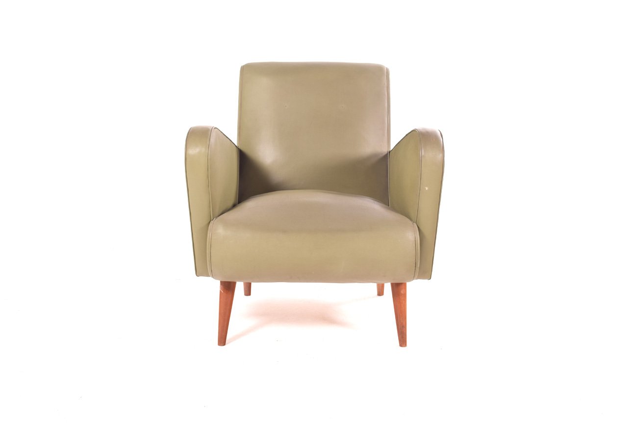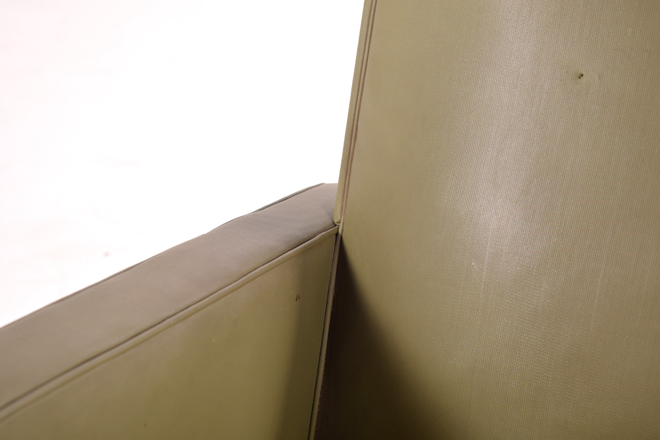 Sofá Single em napa verde e pés de palito em carvalho da época contemporânea. Produzido na década de 1970 em Portugal. Dimensões 80x70x75cm.