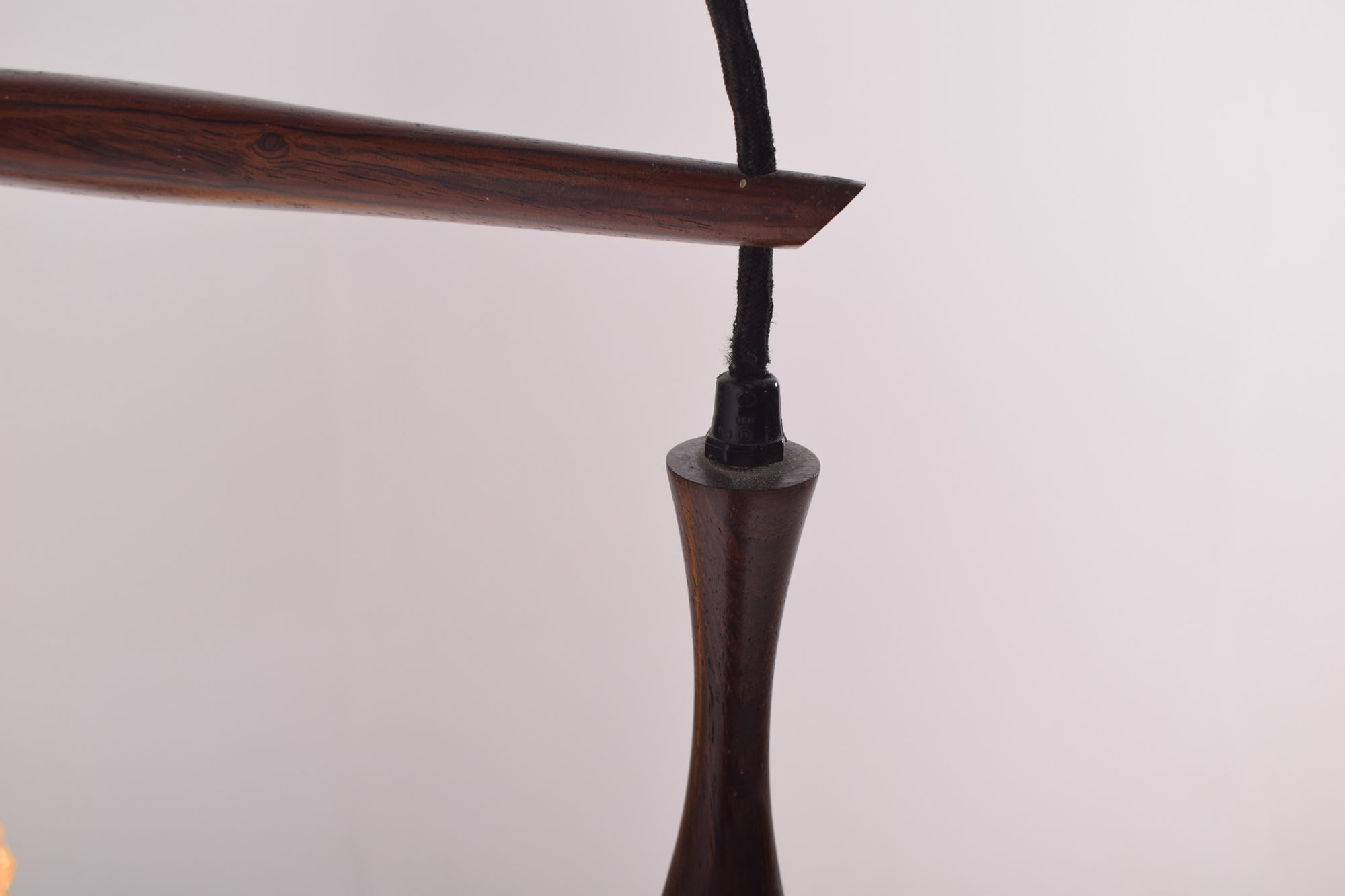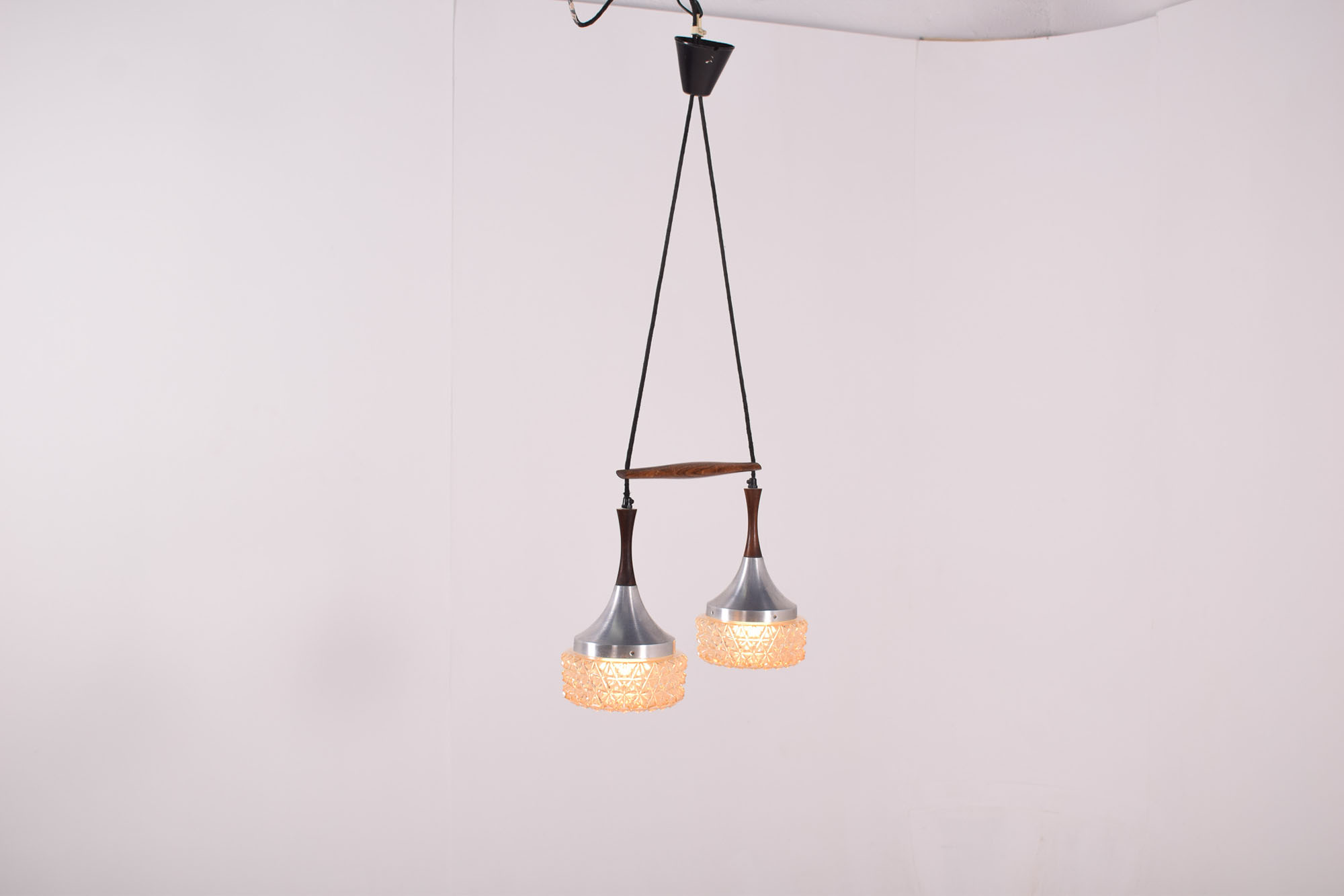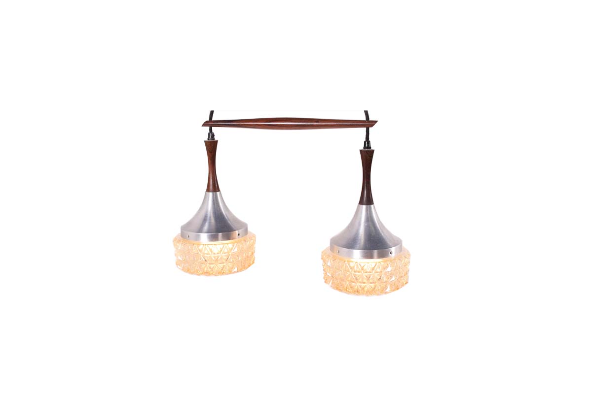 Candeeiro duplo dinamarquês, feito de alumínio e suspenso por uma peça esculpida de pau santo com vidros martelados. O comprimento dos pendentes pode ser ajustado.