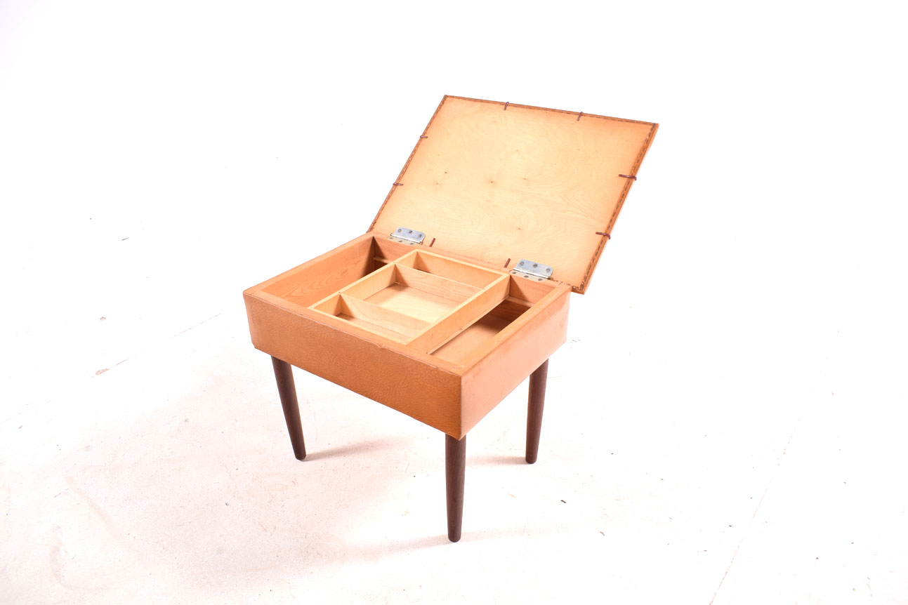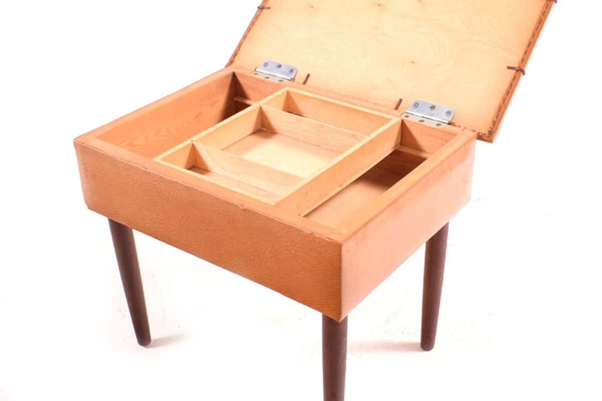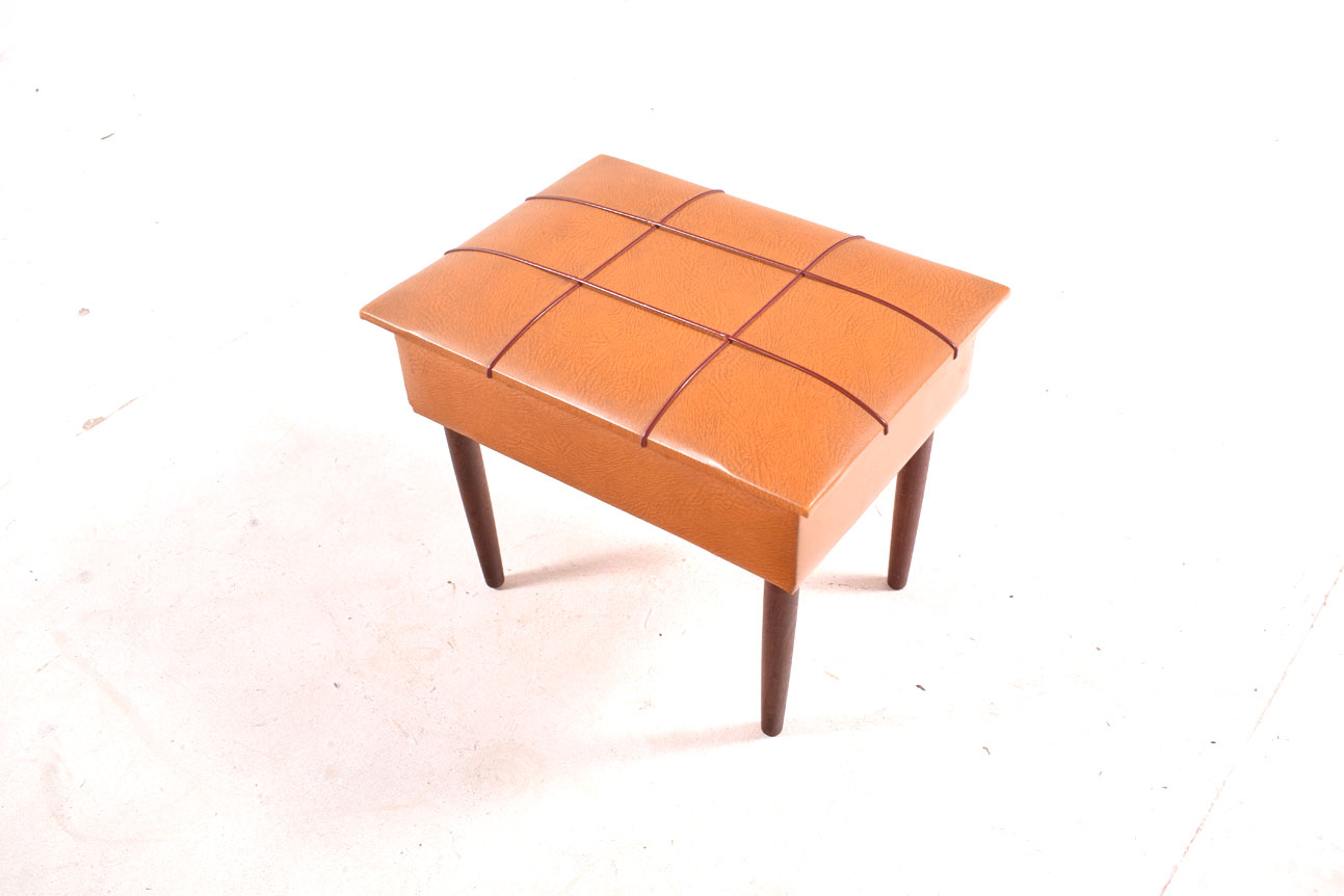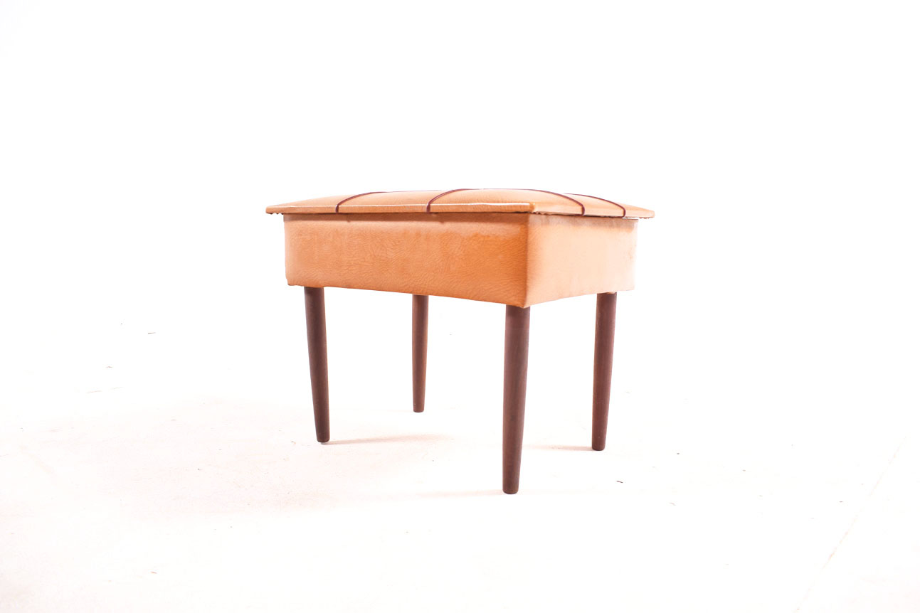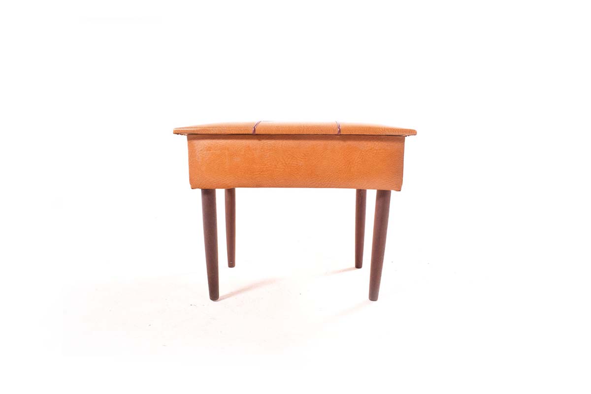 Banco Costureira contemporanêo em teca, pele e carvalho. Produzido em 1950, de origem Dinamarquesa.