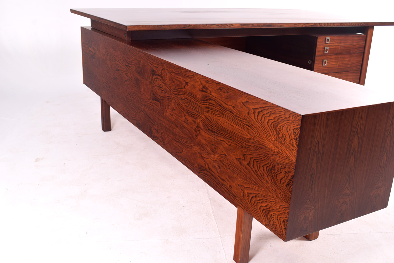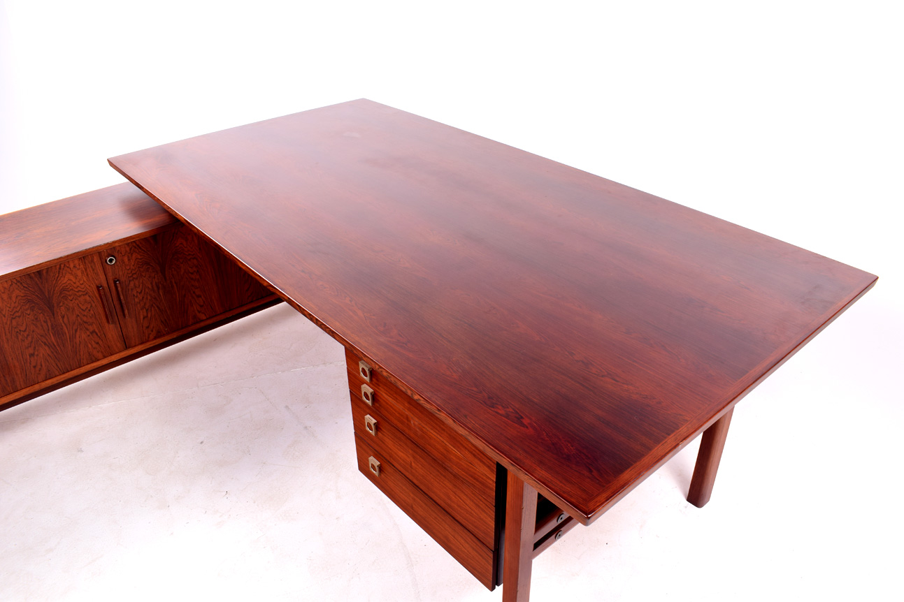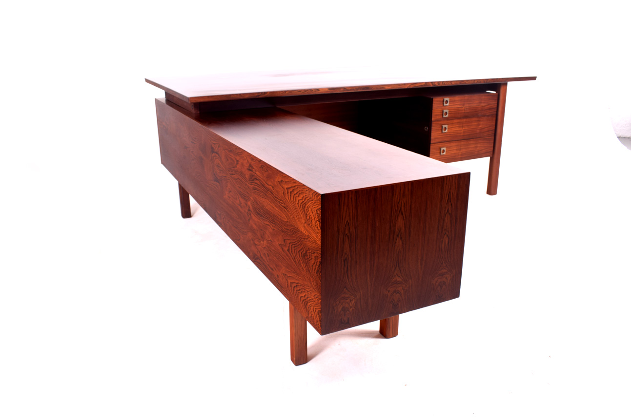 Secretária dinamarquesa em pau-santo com armário lateral. Elegante e funcional, em forma de L, desenhada por Arne Vodder para Sibast. Tem quatro gavetas à direita e o armário à esquerda.