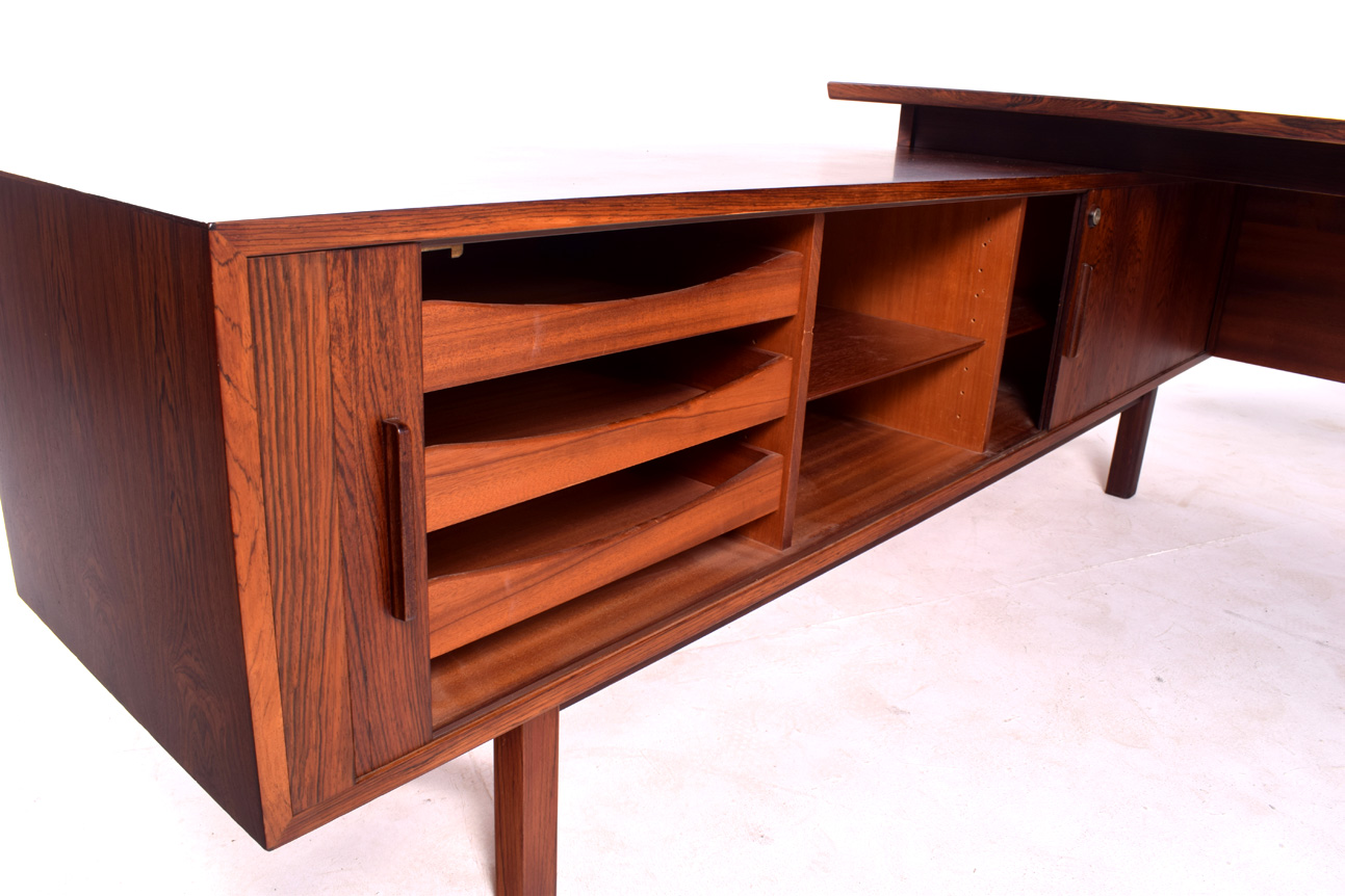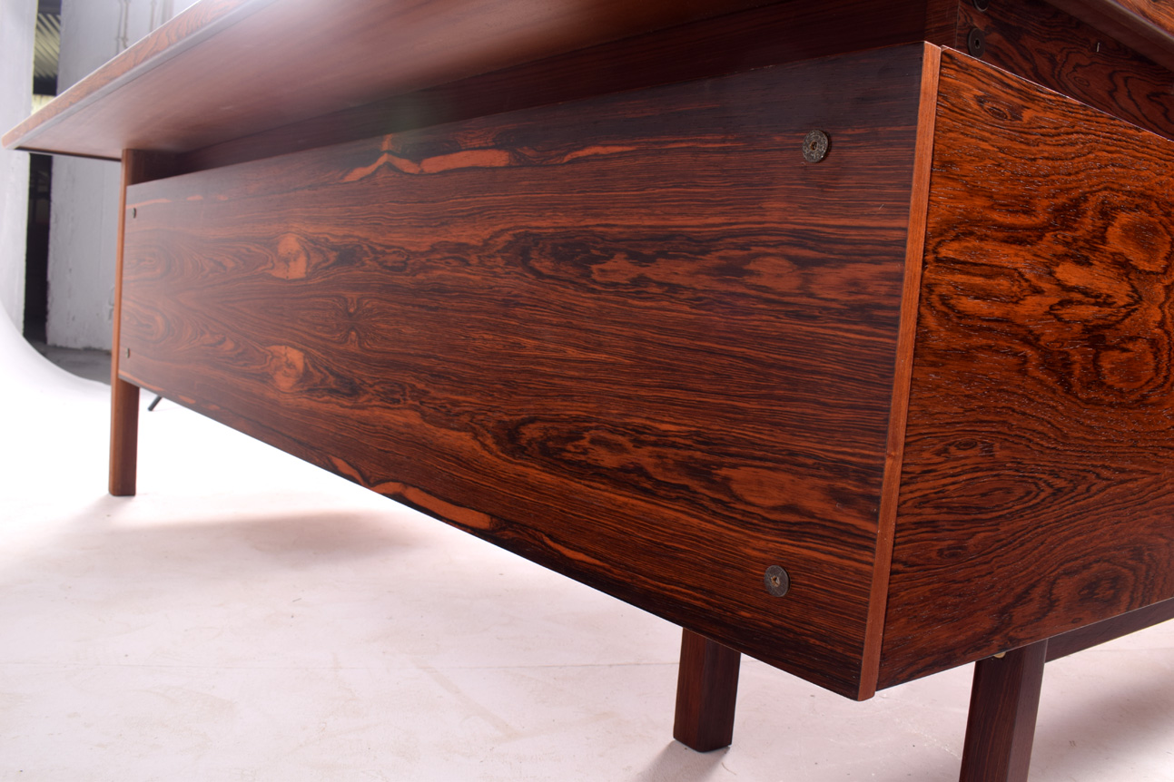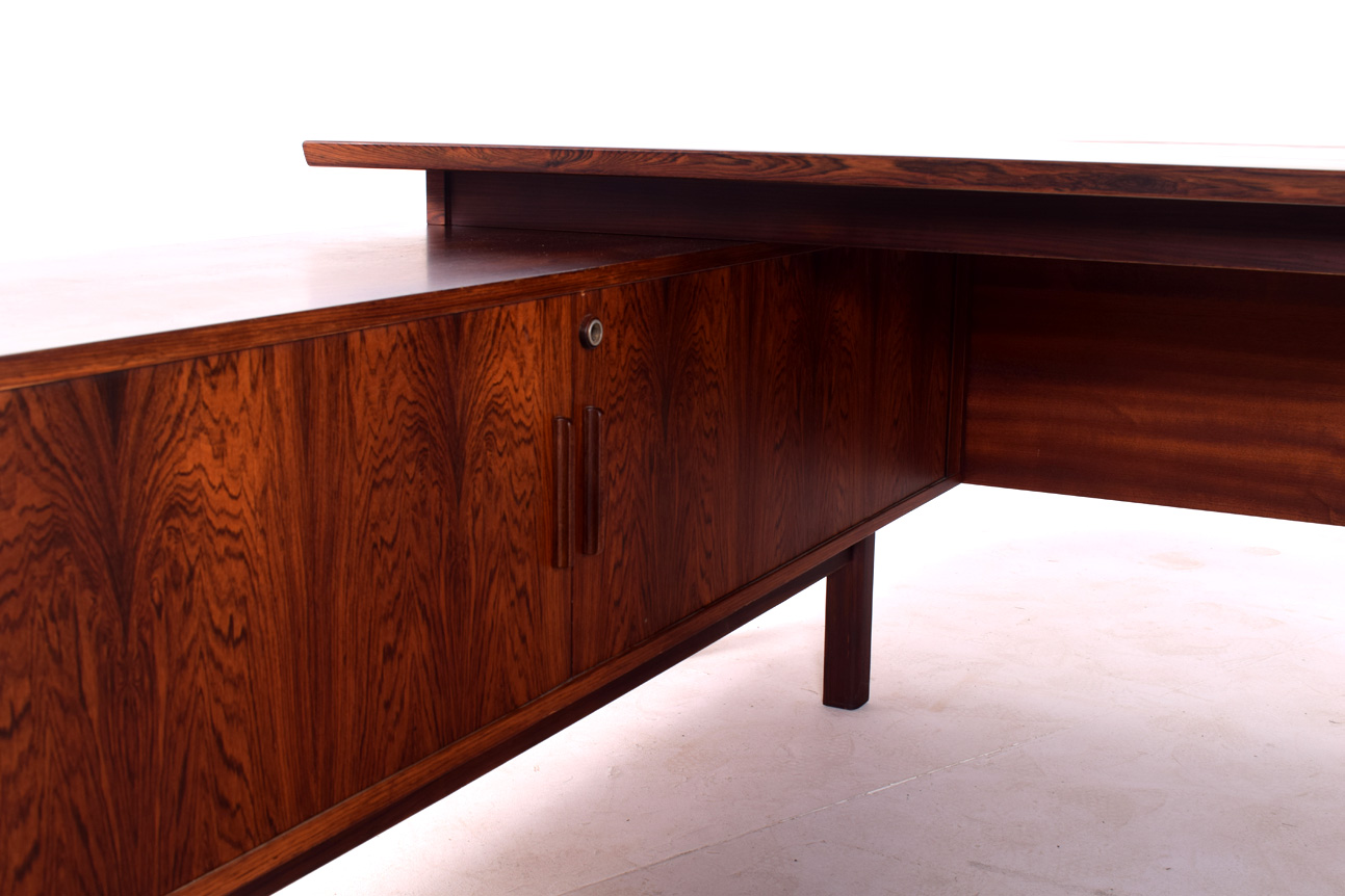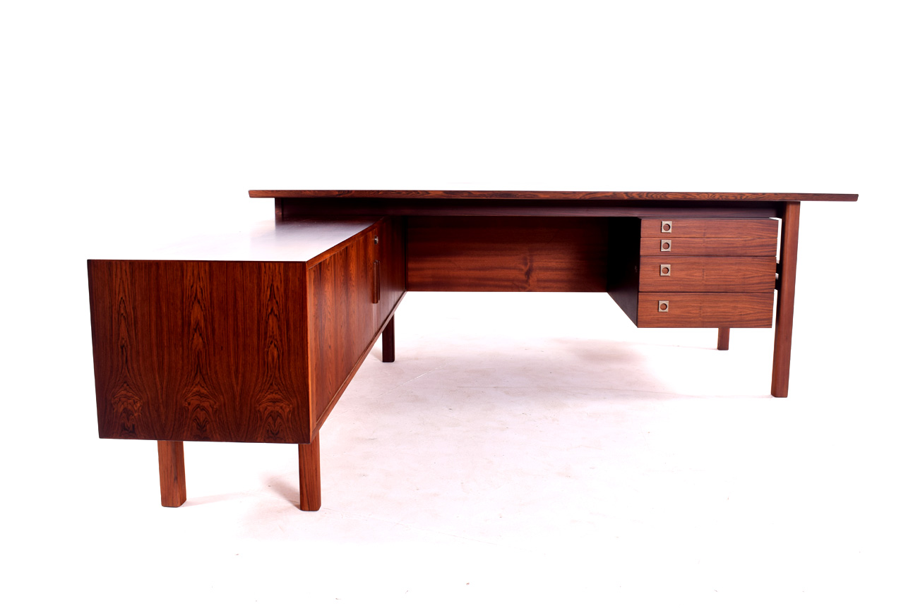 Secretária dinamarquesa em pau-santo com armário lateral. Elegante e funcional, em forma de L, desenhada por Arne Vodder para Sibast. Tem quatro gavetas à direita e o armário à esquerda.