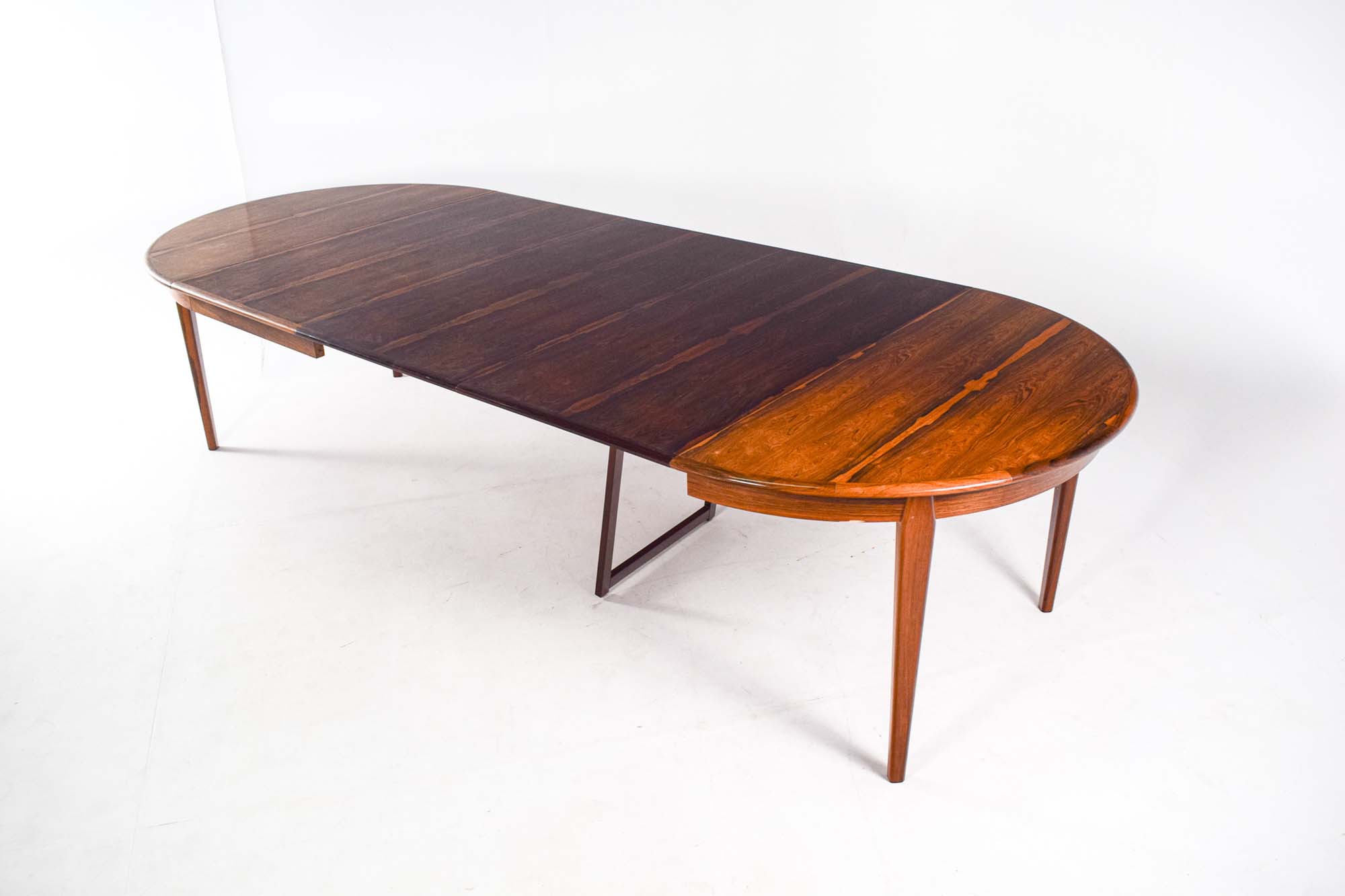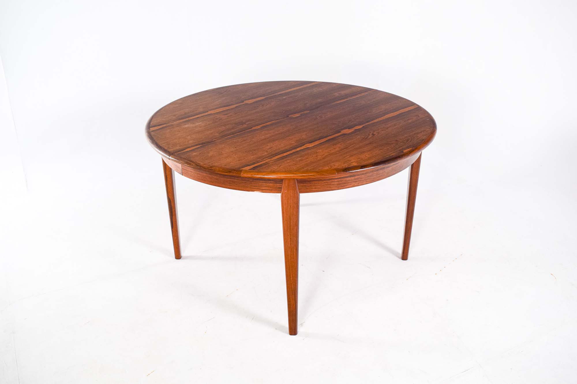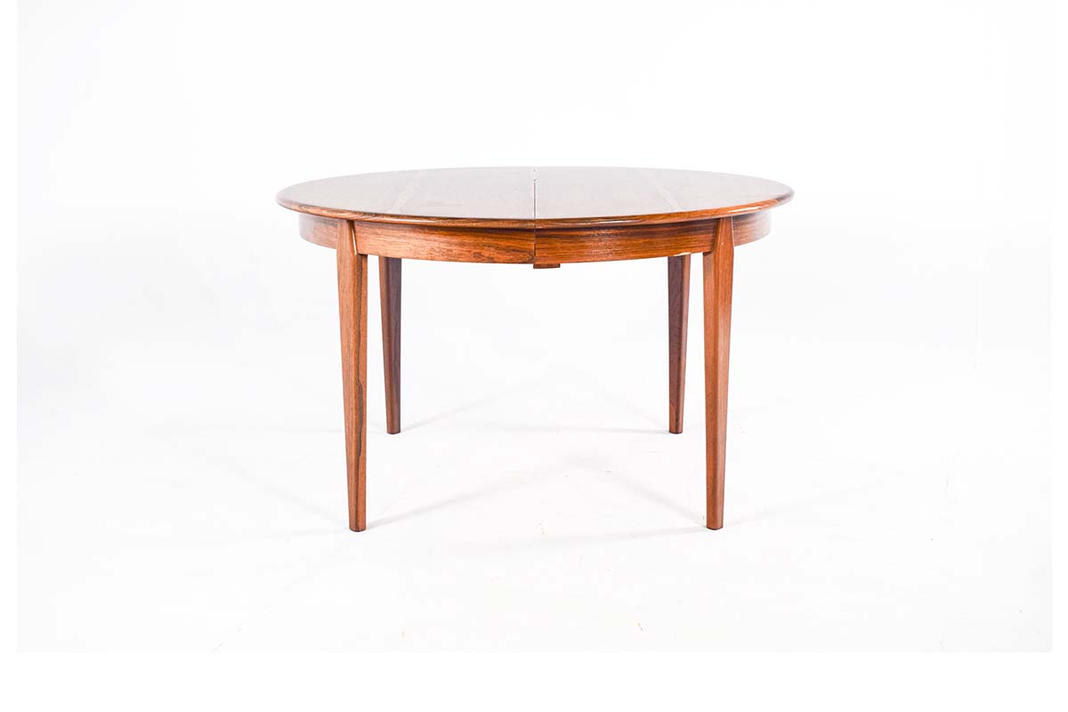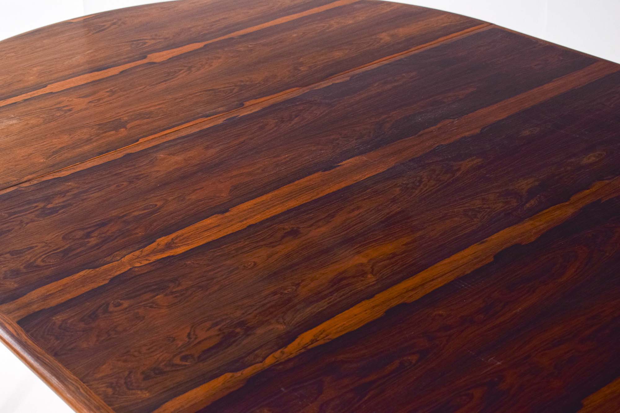 Mesa de jantar redonda extensivel, em pau-santo. Fabricada por H. Sighs & Sons. Bela mesa, em que as pernas se ligam de forma elegante ao tampo, podendo ser utilizadas 3 tábuas com 60 cm cada para que a mesa atinja os 304 cm. Fora de stock. Veja mais mesas