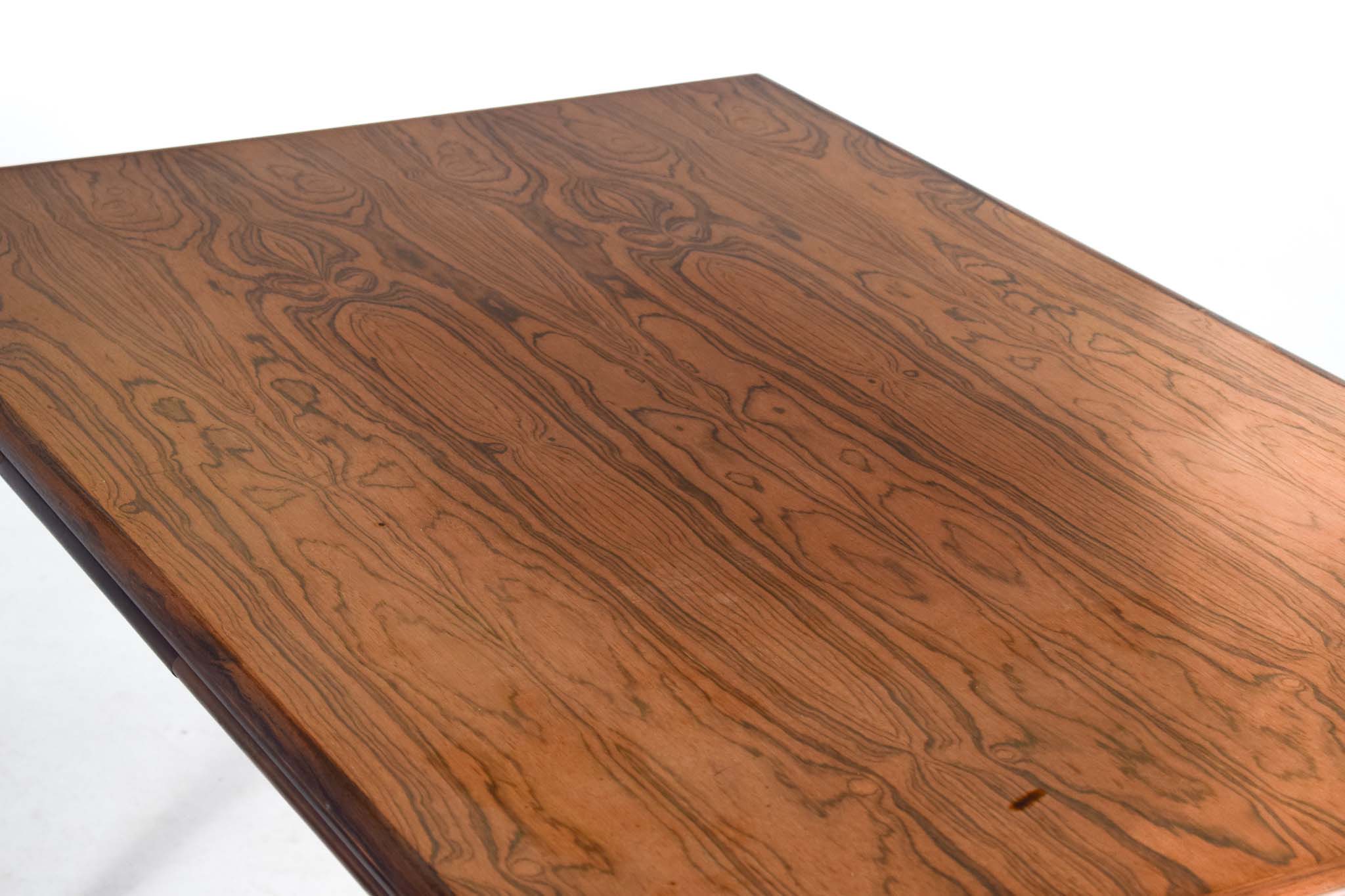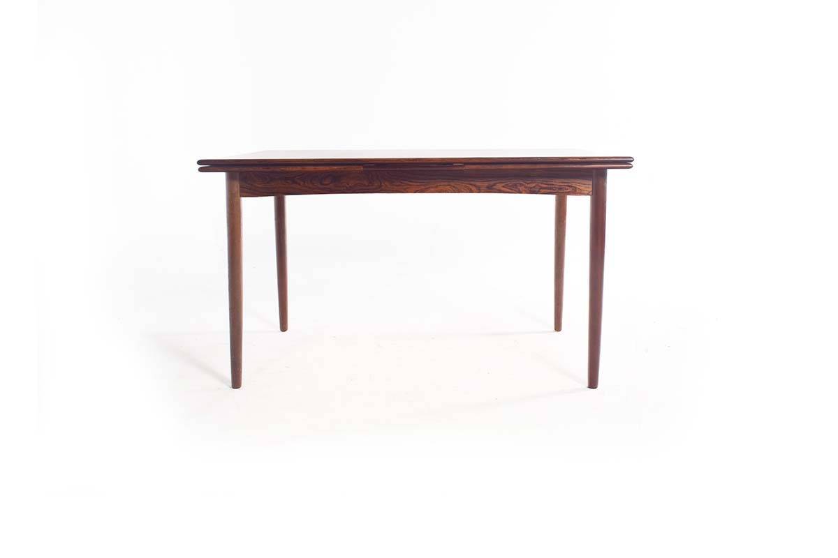Excelente mesa de jantar extensível de meados do século feita em madeira de pau santo por um marceneiro dinamarquês na década de 1960.
