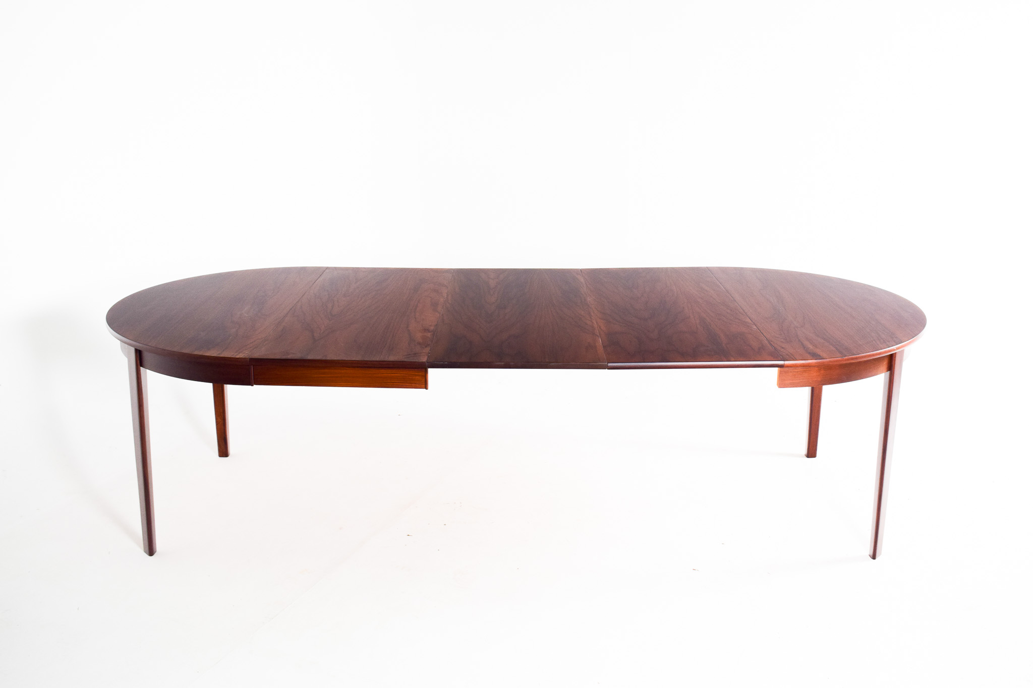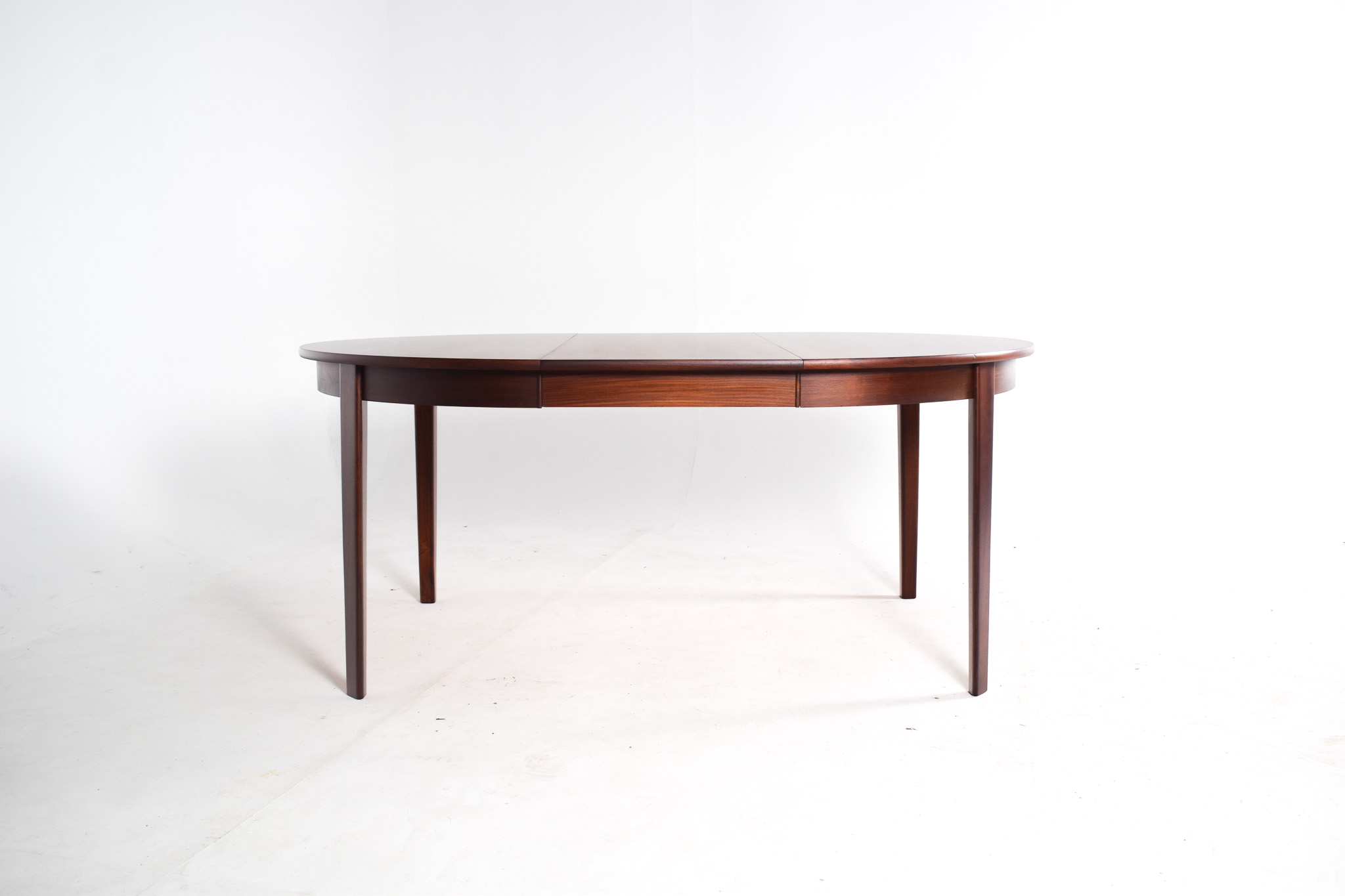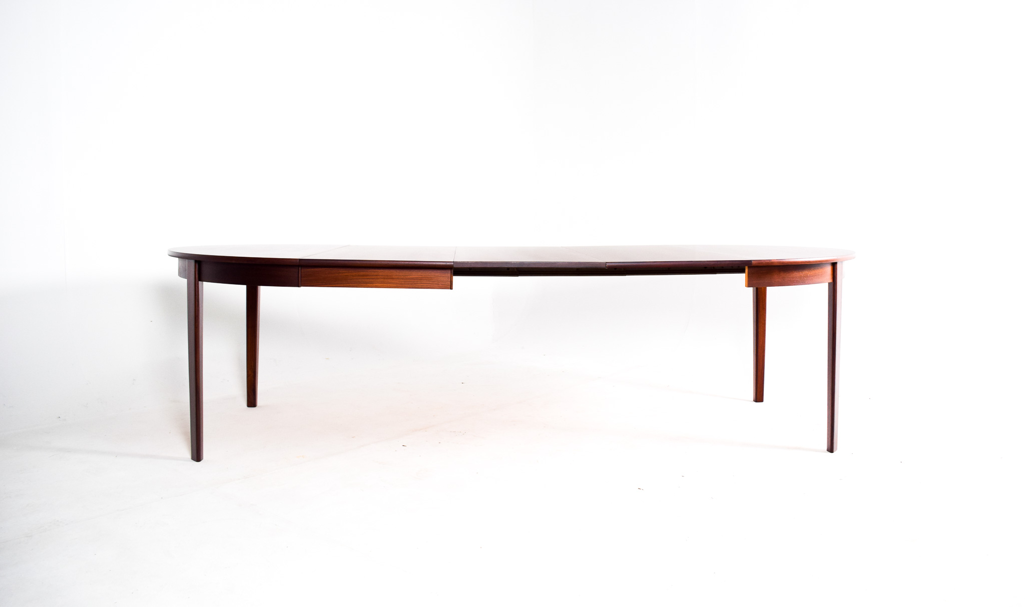 Mesa de jantar redonda, em pau-santo. Com três tábuas de extensão, duas delas são diferentes na borda. Dinamarca, anos 60.