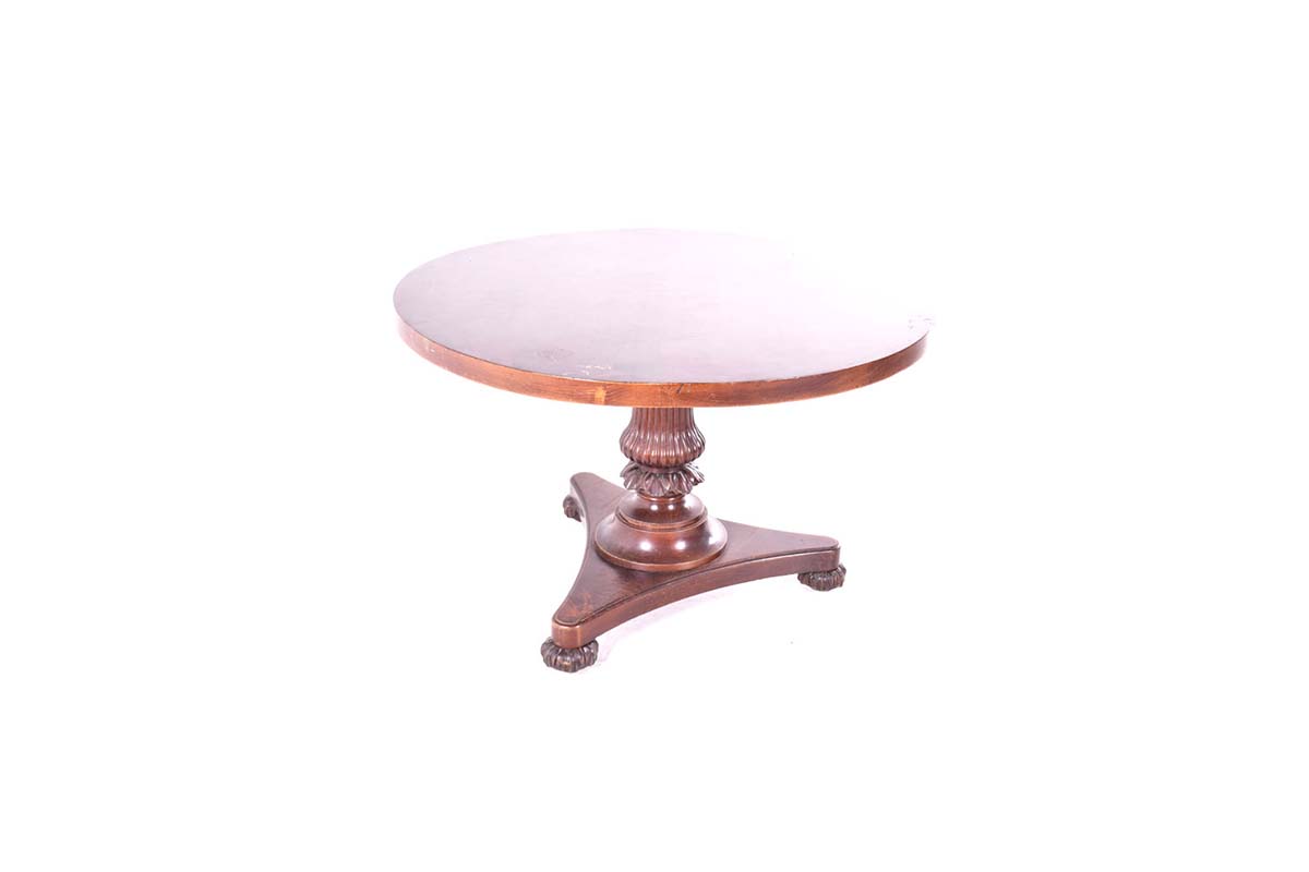 Mesa de centro redonda, com pé central trabalhado. Da época Regência. Séc. XX e de origem Inglesa. Fora de stock. Veja mais mesas