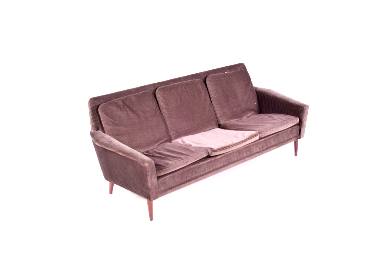 Sofá em Madeira e Bombazine Castanha da época contemporâneo. Produzido em 1960 na Dinamarca. Fora de stock. Veja mais sofás