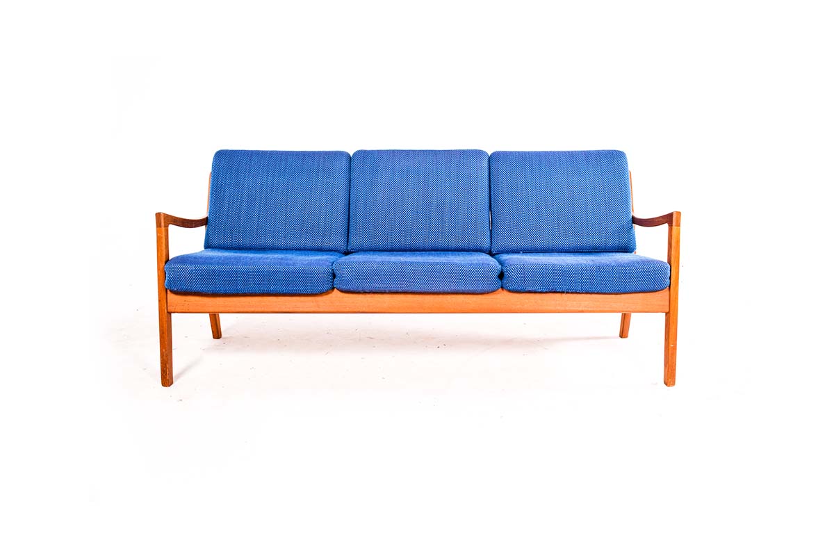 Sofá de três lugares em teca, com estofo azul. Desenhado por Ole Wanscher, modelo Senator 166, para France & Son. Dinamarca, anos 60.