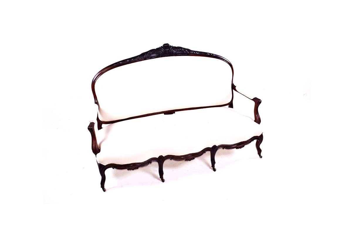 Louis XV sofa in rosewood, upholstered in beige fabric on the back, seat, and arms. Century 20th century, French origin.