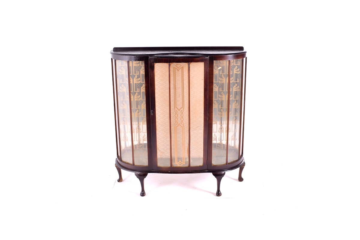 Mahogany display cabinet. Glass doors painted in gold. From the Queen Anne era. Century 20th century and originally from Portugal.