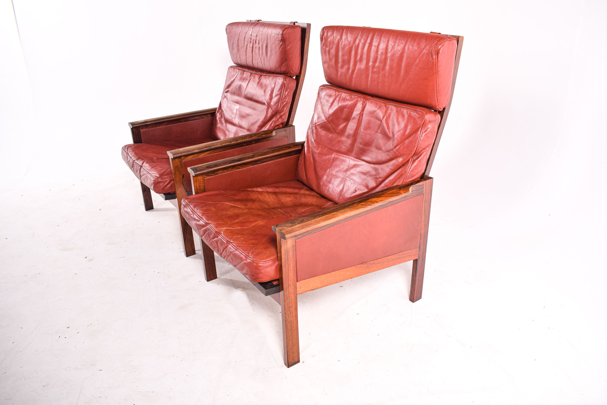 Pair of Rosewood Armchairs, designed in the 60s by Illum Wikkelso and produced by Niels Eilersen, Denmark. Armchairs with high backs, comfortable and in excellent condition. Capella model.