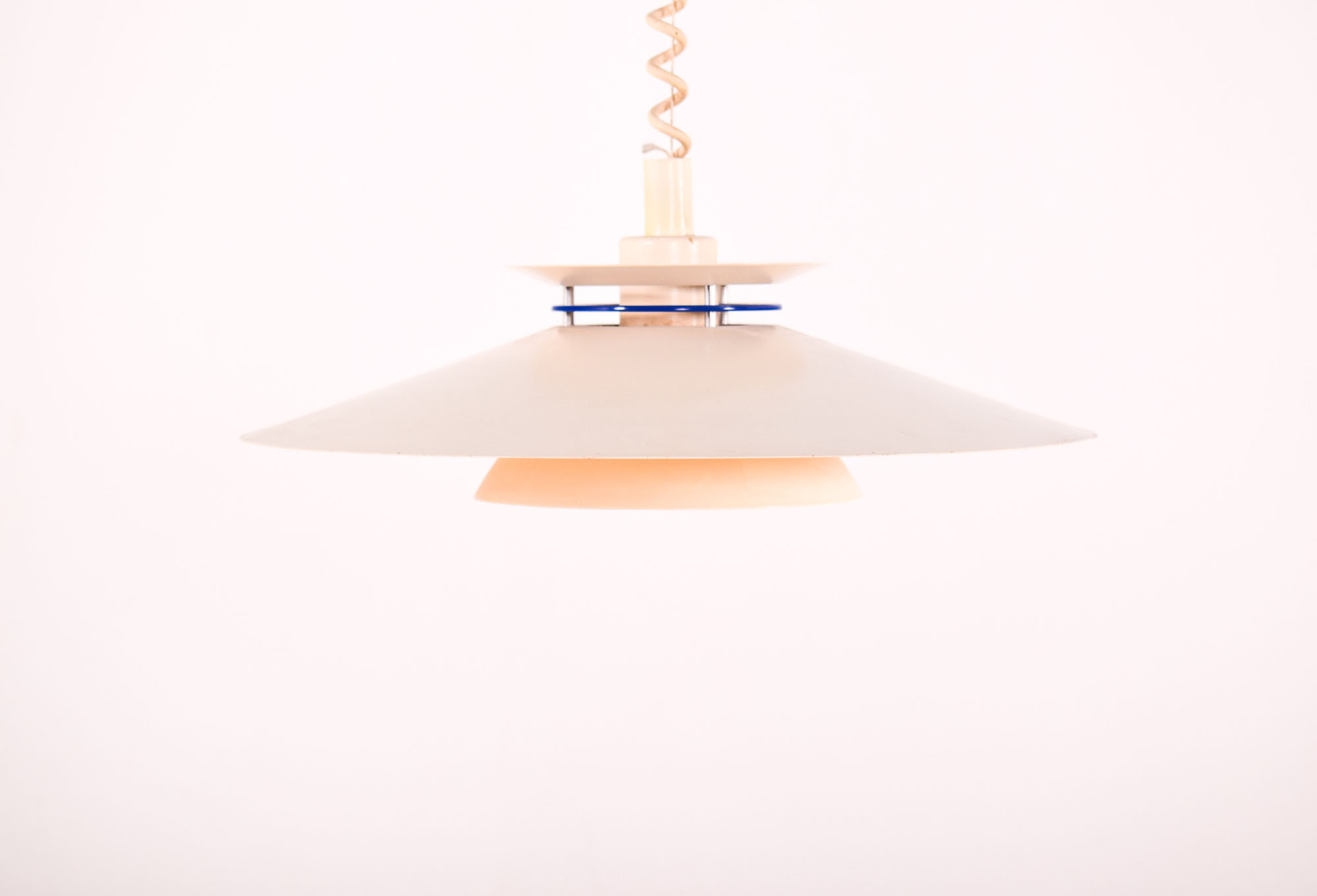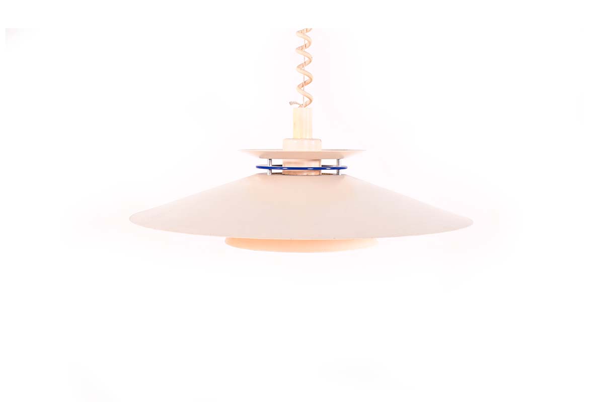 Danish ceiling lamp by Dana Light, made of white lacquered aluminum on a blue threaded rod. Out of stock. See more lamps